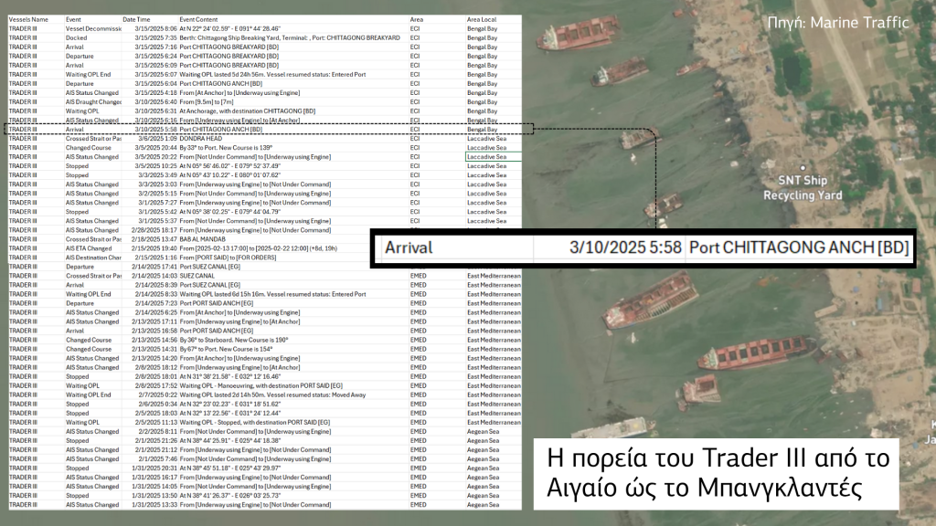 Το σημερινό ρεπορτάζ μας αποκαλύπτει πώς μέσα σε λίγες μέρες το δεξαμενόπλοιο Trader III (IMO 9213416) κατέληξε από τα συμφέροντα του κ. Μαρινάκη σε διαλυτήριο πλοίων του Μπανγκλαντές, όπου η διάλυση τάνκερ αποτελεί μία από τις πιο θανατηφόρες και περιβαλλοντικά επιζήμιες εργασίες στον κόσμο.