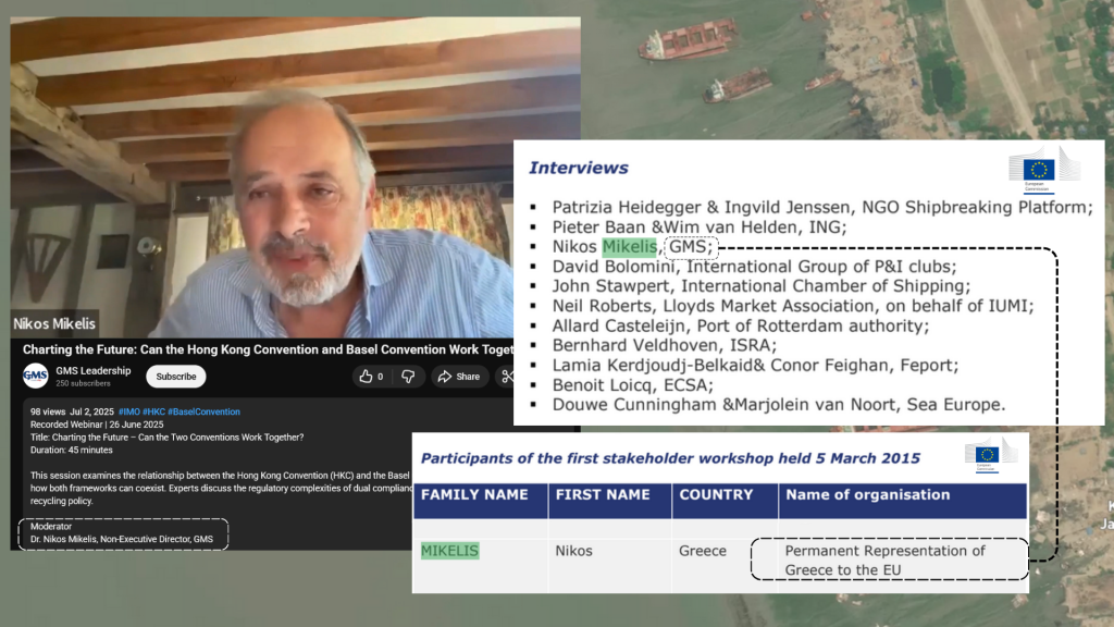 Ο ίδιος μας απάντησε: «Το 2016 εργαζόμουν ως ανεξάρτητος σύμβουλος. Εκείνη την περίοδο παρείχα τις υπηρεσίες μου κυρίως στην GMS και στον Διεθνή Ναυτιλιακό Οργανισμό (IMO). Όλες αυτές οι πληροφορίες ήταν γνωστές στις ελληνικές Αρχές και ήταν επίσης δημόσια διαθέσιμες. Ως διεθνώς αναγνωρισμένος ειδικός σε θέματα σχετικά με τη “Διεθνή Σύμβαση του Χονγκ Κονγκ για την Ασφαλή και Περιβαλλοντικά Ορθή Ανακύκλωση Πλοίων”, κι έχοντας ακόμη βαθιά γνώση του Ευρωπαϊκού Κανονισμού για την Ανακύκλωση Πλοίων, είχα τη χαρά να προσφέρω τις υπηρεσίες μου αφιλοκερδώς, συνοδεύοντας τον ακόλουθο του ελληνικού υπουργείου Ναυτιλίας στην (σ.σ.: αρμόδια) επιτροπή της Ευρωπαϊκής Επιτροπής, και να έχω την τιμή να εκπροσωπήσω τη χώρα μου, όπως ευγενικά μου ζητήθηκε από τις ελληνικές Αρχές, ενεργώντας πάντα υπό τις οδηγίες τους. Είναι σύνηθες οι τεχνικοί εμπειρογνώμονες που συμμετέχουν σε τέτοιου είδους συναντήσεις να έχουν σχέση με τη βιομηχανία λόγω της τεχνικής φύσης των ζητημάτων που τίθενται προς συζήτηση».