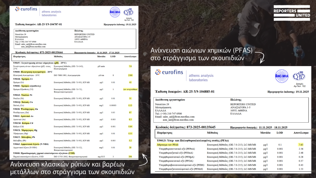 Η ανάλυση των δειγμάτων έγινε σε ιδιωτικό εργαστήριο της Αθήνας (Eurofins, πρώην Αναλυτικά Εργαστήρια Αθηνών). Θέλαμε να διαπιστώσουμε όχι μόνο αν περιέχουν τους κλασικούς ρύπους των χωματερών (οργανικό φορτίο COD, αμμωνιακό άζωτο κτλ), αλλά και κάποιες από τις τοξικές ουσίες που ξεπλένονται από τα σκουπίδια: βαρέα μέταλλα και αιώνια χημικά PFAS. Στο δείγμα βρέθηκαν και οι κλασικοί ρύποι, και βαρέα μέταλλα πολύ πάνω από το όριο για το πόσιμο νερό, καθώς και αιώνια χημικά (PFAS) σε συγκεντρώσεις 7650 ng/l, δηλαδή 76 φορές πάνω από το όριο που κατατάσσει μια περιοχή ως «hotspot». Πρόκειται για επικίνδυνα υγρά απόβλητα που χρειάζονται επεξεργασία, όχι για κάτι που μπορεί να μένει στο περιβάλλον.