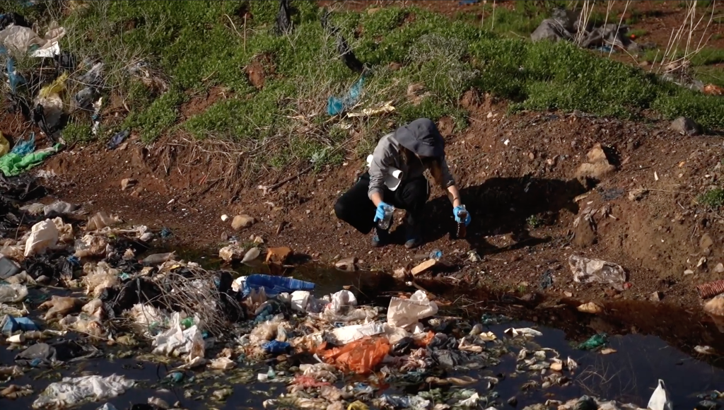 Αποφασίζουμε να ψάξουμε τι περιέχουν τα στραγγίσματα, με τη βοήθεια ειδικού εργαστηρίου. Συγκρατούμε την αηδία μας και βάζουμε σε μπουκάλια υγρό από την τάφρο με τα μαύρα νερά, στα οποία κολυμπάνε σακούλες και άλλα πλαστικά.